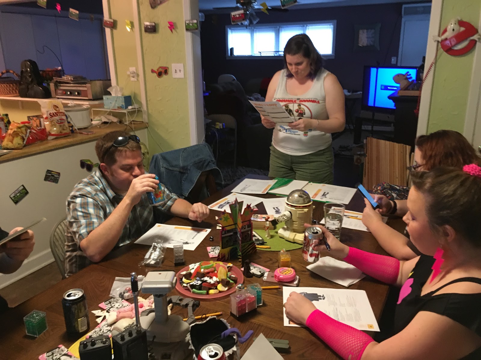 We went all out for this game, decorating the house with 80s signage and an assortment of Iconic Items. Several of us wore 80s garb. And some of the players (and I) live-tweeted the game on Twitter. (I will talk more about decorating for a Tales from the Loop game in a later post.)